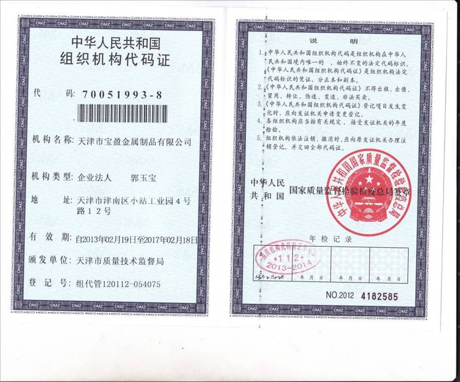 天津市寶盈金屬制品有限公司成立于1998年,公司坐落于天津市津南區(qū)小站工業(yè)園。距津港高速公路2公里,塘沽港25公里,天津濱海國際機場25公里,海、陸、空交通十分便利。公司占地面積10000平方米,年生產能力4500噸金屬制品,包括辦公室人員及車間工人寶盈共有100多名員工。 2010年6月2日,通過了ISO9001:2008質量管理體系認證,2012年5月由摩迪國際進行焊工考試,取得EN 287-1焊工資格證書。